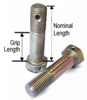 Hex head aircraft bolts are made of high-strength type 4037 or 8740 alloy steel (type 8740 is most commonly used). The bolts are centerless ground and threaded after heat treatment. Minimum tensile strength 125,000 PSI. Cadmium plated per specification QQ-P-416A, Type II, Class 3. Available with shank drilled for cotter pin or undrilled for stop nut application, and with or without drilled head for safety wire. Specify bolts to have undrilled shank by adding letter "A" after the dash number. For bolts with drilled head add letter "H" after the AN number. See illustrated examples. The length of AN aircraft bolts is measured from under the head to the end of the shank. The "grip" is the unthreaded portion of the shank. See table for conversion of length and/or grip to proper AN callout.