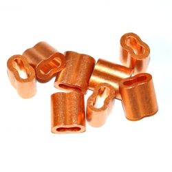 Oval shaped copper sleeves used in making eye or lap splices in flexible cable. Sleeves are slipped over the two strands of cable to be fastened and are then compressed with special Nicopress hand squeezers. Provides a bond that is even stronger than a standard splice.