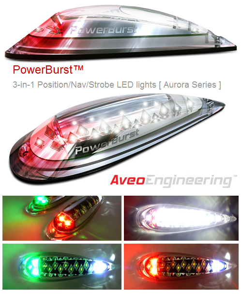 14 Volt Navigation/Position/Strobe LED wing lights [from the AveoEngineering Aurora Series of AveoFlash lighting] At less than an inch in height (0.87 inch/22 millimeters), the new PowerBurst™ wing light not only saves you on drag but its low price saves you on dollars. It is a value light that does not sacrifice anything in performance nor in standards as do other economy-priced lights offered by other light manufacturers. Aveo's exclusive and highly advanced optics and chromed reflector system, Aveo's unmatched power and led management circuitry, and Aveo's famous lowest-drag profile in the industry are all combined into this product to give you unmatched POWER and FEATURES. Plus there is a 3 year limited warranty from Aveo on led burnout. MAIN FEATURES: PLEASE NOTE: The PowerBurst™ is only for 14 volt applications. Sold as a pair of lights: one green navigation with white position and strobe function, and one red navigation with white position and strobe function. Features Specifications