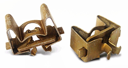 Cage type. Permit mounting of aircraft instruments from the front of the panel. No charge in panel or instrument design required. Non-magnetic (speed nut is brass; cage is phosphor bronze). Conform to MIL-N-3336. Cage is easily compressed with finger-pressure to allow insertion of legs into clearance holes. When fully inserted and pressure is released, legs spring apart; retain SPEED NUT in screw-receiving position. Turned down corners hold firm against force of in sert ing screw and screw-tightening torque. All instrument mounting nuts listed below take a 6-32 machine screw.