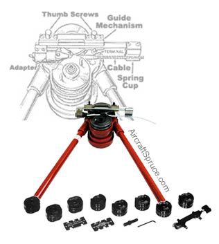 This portable, hand-operated roll type swaging machine will swage MS type terminals onto galvanized and stainless steel cables from 1/16" diameter up to and including 3/16" dia. Includes machine, a full set of roll dies, terminal gauges and feed guide adapters and instructions in a steel carrying case. Wt. 95 lbs. New manufacture. All replacement parts available. Special order