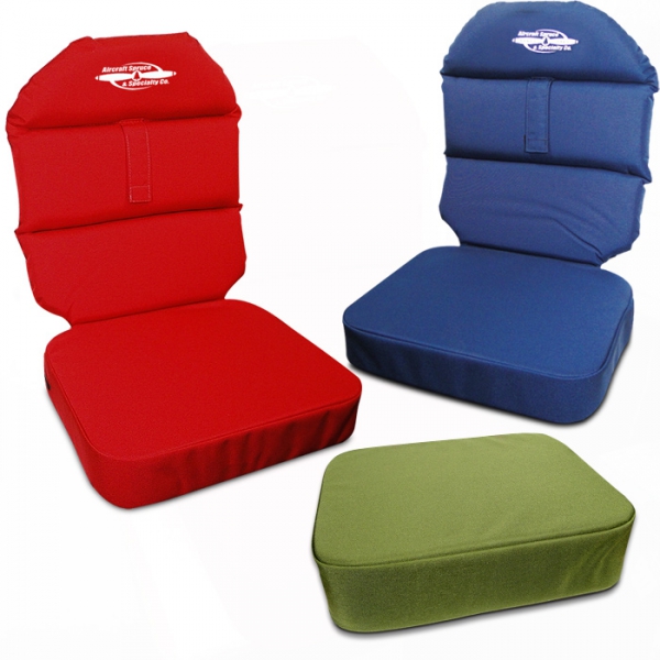 Sit higher, and sit softer on 2 or 3 inches of high-density foam covered with durable, "breathable" Cordura. Made of USAF specifications, with segmented backrest. Really makes a difference on a long flight. Also available: 3 or 4-inch thick child's cushion that finally lets kids see outside, keeps them interested as well as comfortable during long trips. Both seat and cushion are available in Air Force blue, red, or olive drab.