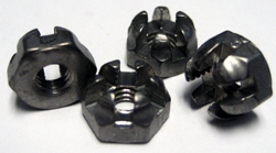 Fabricated from steel and cadmium plated per QQ-P-416A, Type II, Class 3. AN310 castle nuts are used with drilled-shank bolts, clevis bolts, eye bolts and studs. The slots in the nut accommodate a cotter pin for safety purposes. The thinner AN320 castellated shear nut, with half the tensile rating of the AN310 nut, is used with clevis bolts and threaded taper pins which are subject to shearing stress only.