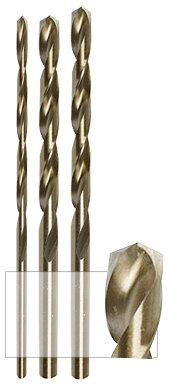 These super cobalt hi-speed jobber length aircraft drill bits feature heavy duty construction to Type J aircraft specifications. Use to drill hard, tough metals, stainless steels, iron based and titanium alloys, and certain plastics. Hardness of cobalt permits speeds 30% over regular H.S.S. drills. Cobalt drills demand rigidly held, positive feed drilling equipment.